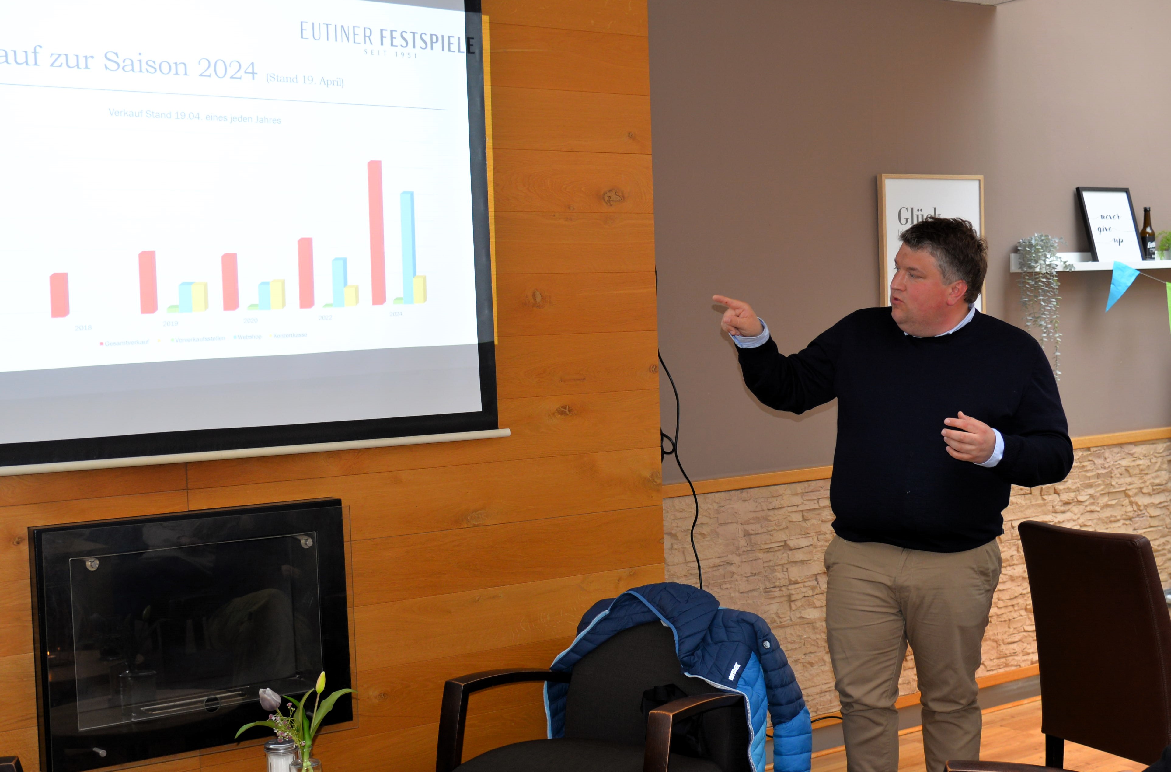 Jörg Brombacher, seit 2019 die Bühnenbilder der Eutiner Festspiele gestaltet und seit 2021 Technischer Leiter, stellte in der Versammlung ausführlich die Bühnenbild-Entwürfe für die beiden großen Produktionen vor. Beim Musical „Jesus Christ Superstar“ werden moderne Medien eine zentrale Rolle spielen, dabei auch überdimensionale Mobiltelefone und bewegliche Türme mit LED-Leinwänden zum Einsatz kommen.