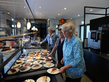 Die Mitglieder des Fördervereins haben wieder eine überwältigende Anzahl größtenteils selbst gebackener Kuchen gespendet. Bei gutem Wetter versammelten sich die zahlreichen Besucher vor dem Gastronomiebereich an den Tischen und auf den Bänken. Dort genossen sie in gelockerter Atmosphäre, vor und nach den Führungen durch die Opernscheune, Kaffee und Kuchen. Beides erhielten sie gegen eine Spende. Außerdem konnten sie Tee und erfrischende Getränke erwerben.