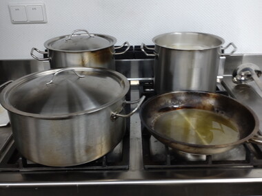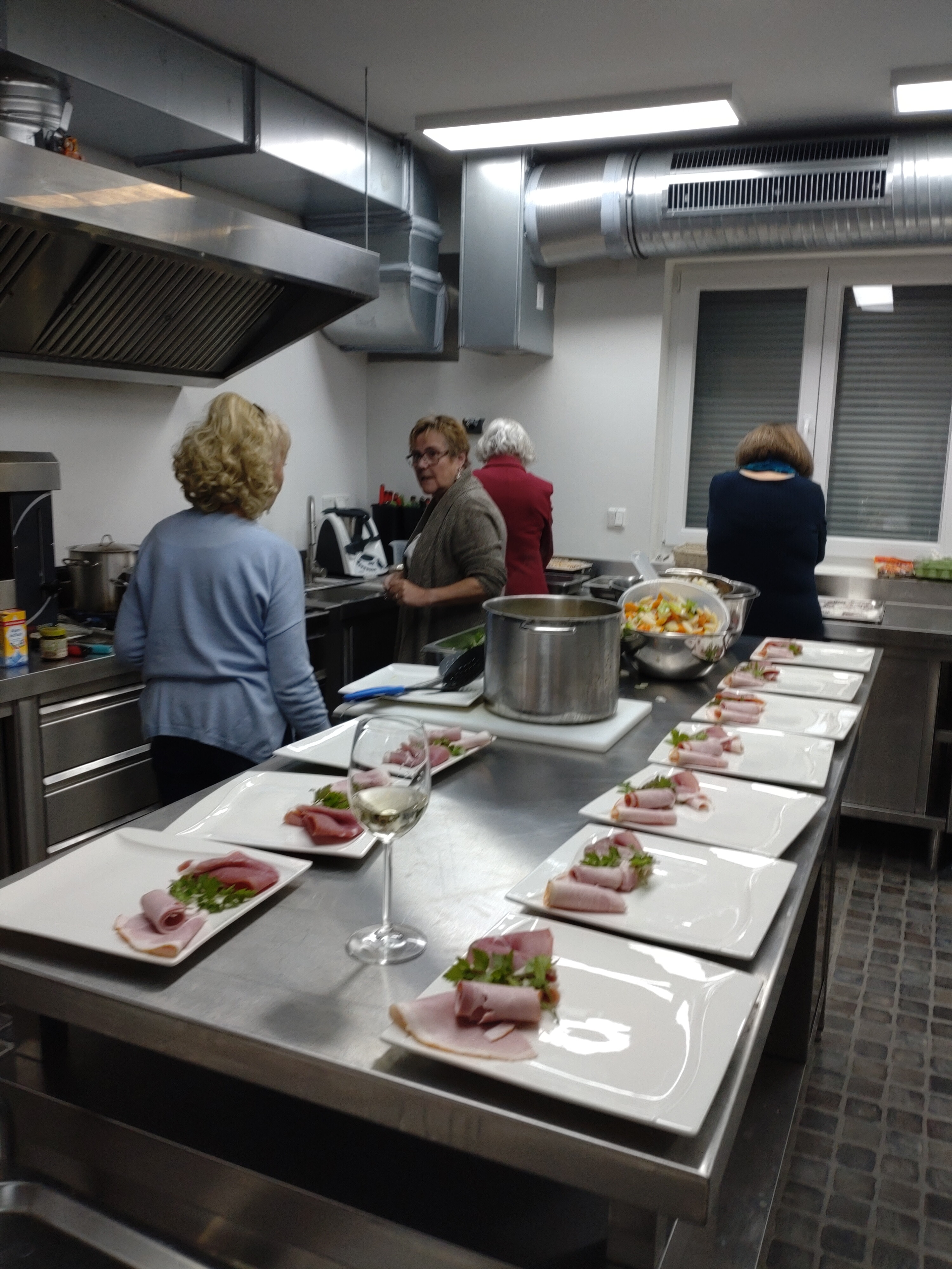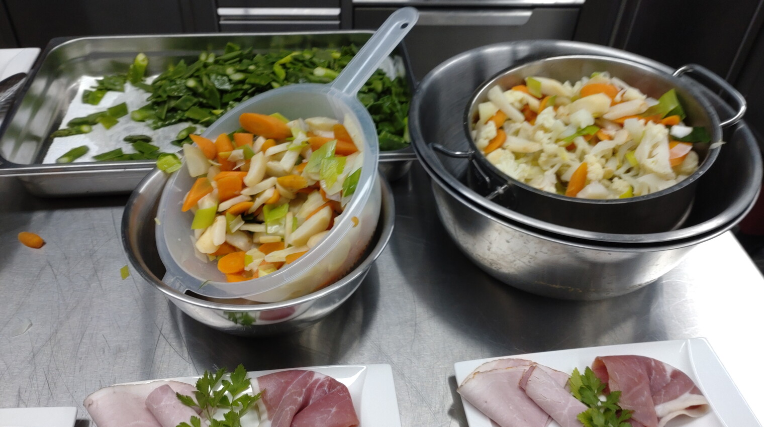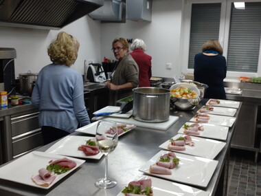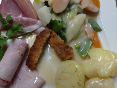 Wir haben dann lange überlegt, was wir stattdessen machen können, da der Schinken ja bereits gekauft war. Mit der Hilfe eines Profis haben wir uns dann für Schnüüsch und Schwiensteert paneert entschieden. Am Vormittag wurde emsig Gemüse geputzt und geschnippelt fürs Schnüüsch, unter Anleitung des Profis Schinken geschnitten, gerollt und paniert für den Schwiensteert. Das gemeinsame Kochen hat unheimlich viel Spaß gemacht.
