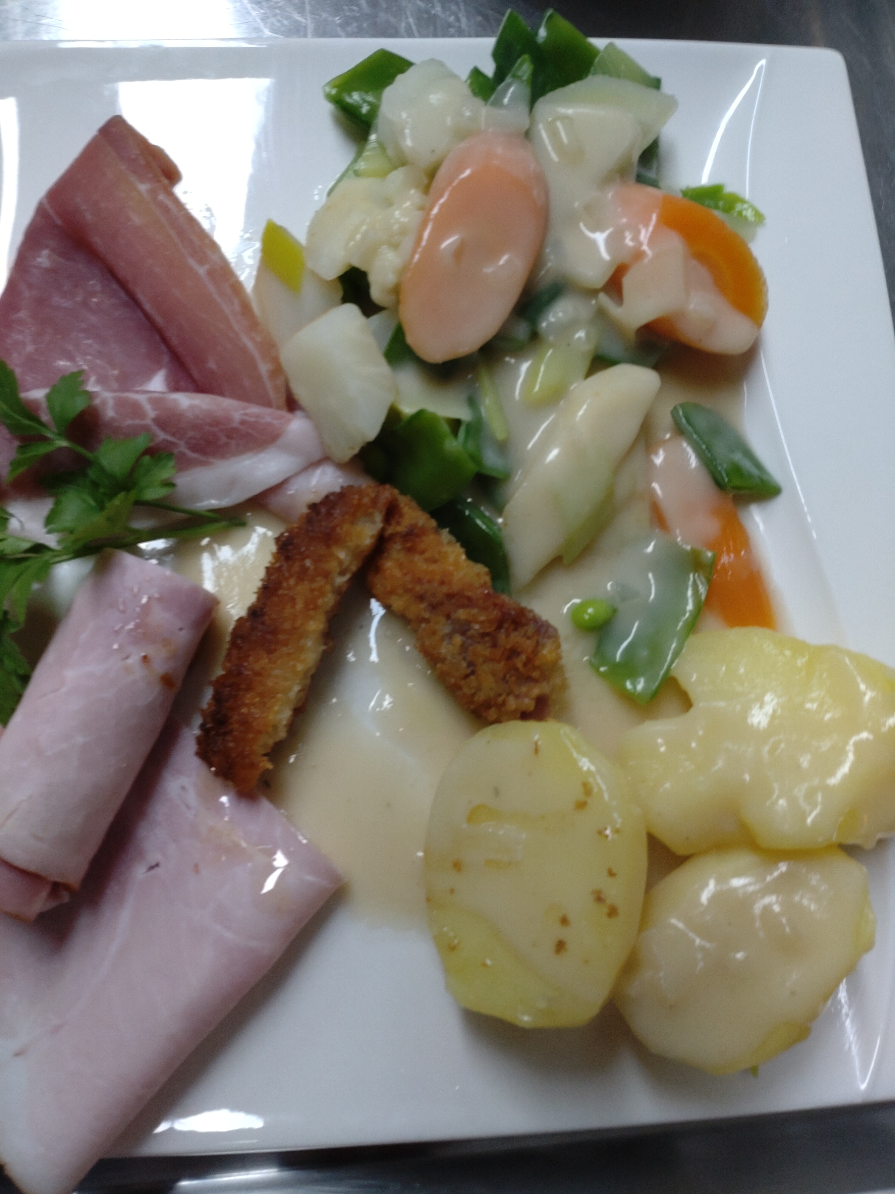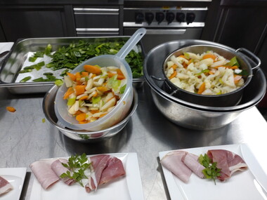 Wir haben dann lange überlegt, was wir stattdessen machen können, da der Schinken ja bereits gekauft war. Mit der Hilfe eines Profis haben wir uns dann für Schnüüsch und Schwiensteert paneert entschieden. Am Vormittag wurde emsig Gemüse geputzt und geschnippelt fürs Schnüüsch, unter Anleitung des Profis Schinken geschnitten, gerollt und paniert für den Schwiensteert. Das gemeinsame Kochen hat unheimlich viel Spaß gemacht.